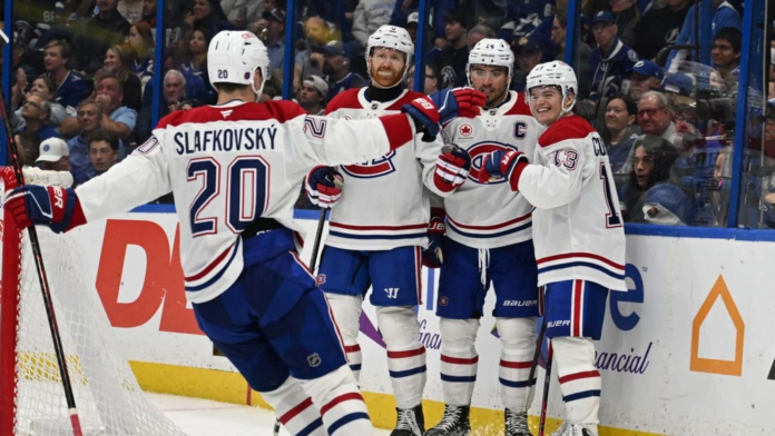 In a second period where the Lightning doubled up Montreal in shots 12-6, the Habs notched the only goal after Anthony Cirelli’s clearing pass was intercepted by Matheson and sent to Slafkovsky, who drove hard to the left side of the net. He then curled a pass to Caufield near an open net at 12:49.
