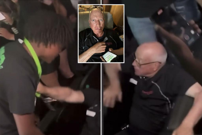 Footage recorded by a bystander shows the teen going berserk on Schlange and throwing him into a row of seats.